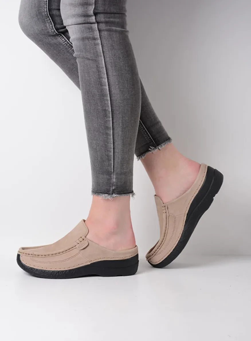 Deze muil uit de Roll Moc-lijn is bij veel Wolky-draagsters favoriet en dat is niet zo gek want je schiet er makkelijk even in. We horen dan ook dat veel dames ’m bij de deur hebben staan, om even de moestuin in te lopen of even wat in de container te gooien. Maar gebruik de Roll Slide ook zeker voor een wandeling. Door de oplopende neus die zo herkenbaar is bij alle Roll Moc-modellen rolt de voet als vanzelf af. De mocassin-maakwijze (handwerk!) zorgt ervoor dat de schoen van binnen lekker zacht aanvoelt. De naden liggen door deze maakwijze namelijk aan de buitenkant en daardoor heb je geen vervelende randen en stiksels aan de binnenkant.Let op: doordat de naden zichtbaar bovenop het voorblad liggen is het verstandig om bij nat weer de schoenen goed in te spuiten met een waterafstotende spray.