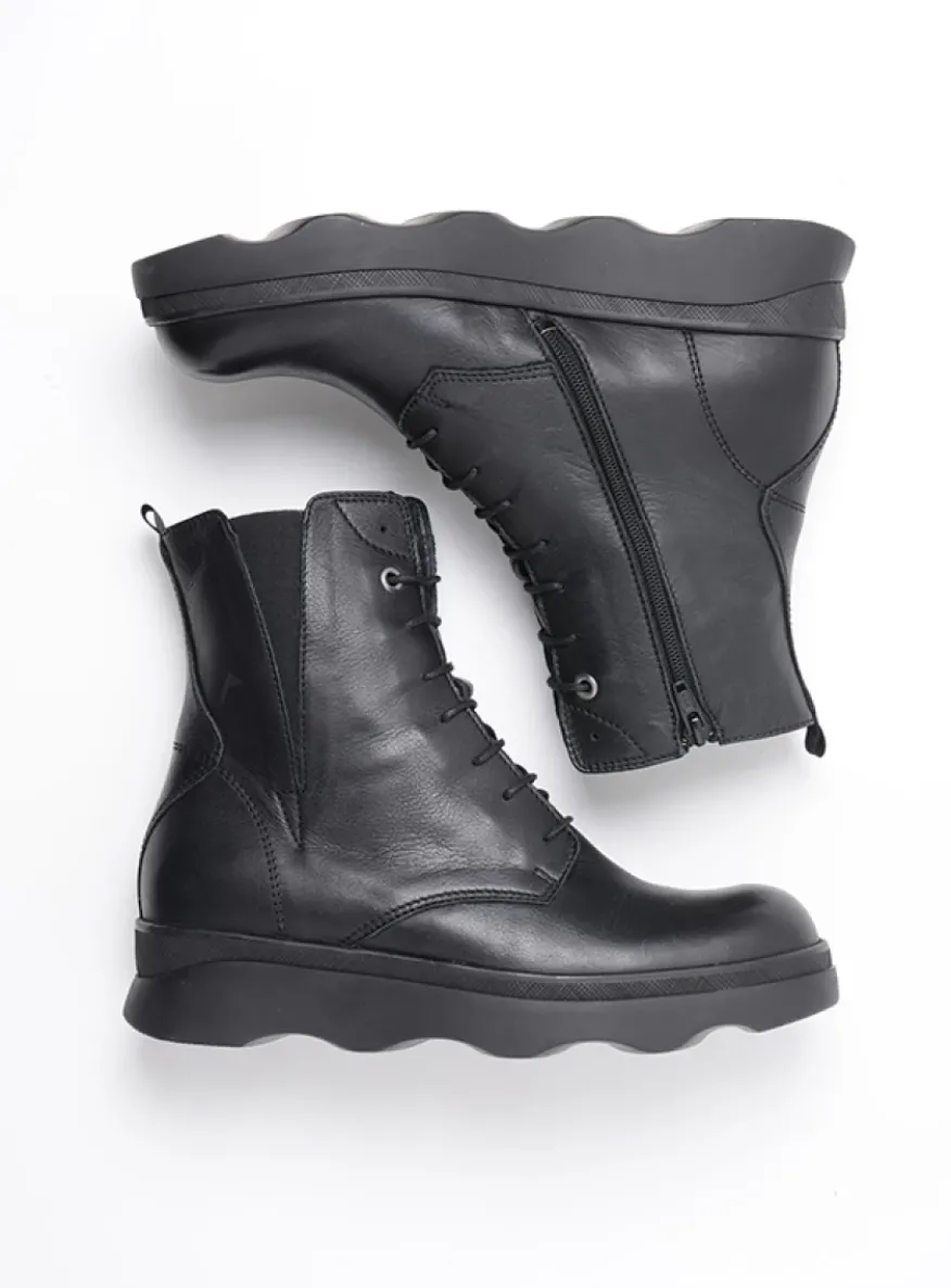 Een veterboot die absoluut gezien mag worden, dat is Wolky’s Akita. De opvallende golvende zool geeft de schoen een speels karakter. Zoals je van Wolky gewend bent, heeft deze zool ook een functie. Hij stabiliseert de voet én zorgt voor extra demping. Dat voel je bij elke stap. Onder het voetbed hebben we een extra laagje foam verwerkt, hierdoor voelt de schoen nog zachter aan. Stel de veter de eerste keer goed af en je kan daarna alleen de rits aan de binnenzijde gebruiken. In no-time heb je de Akita dan aan of uit. Klaar voor een wandeling?