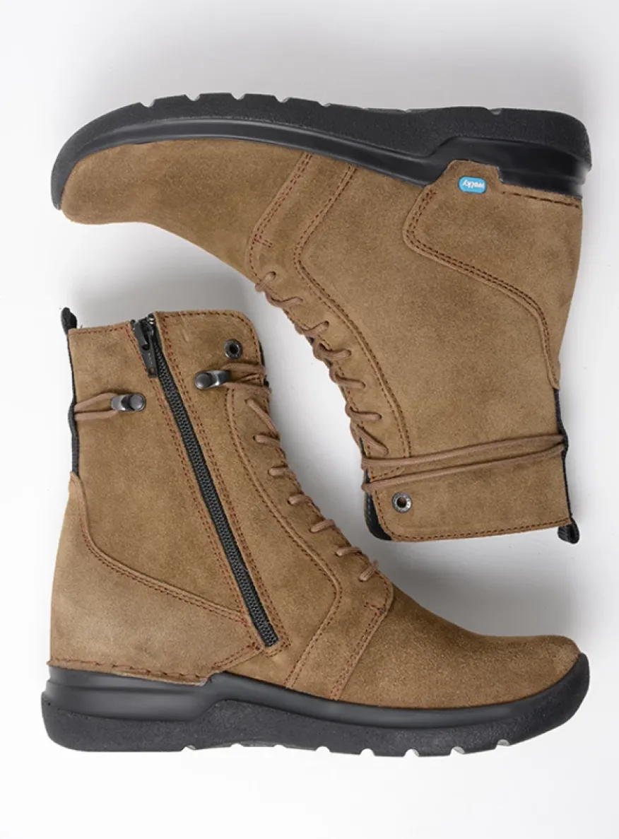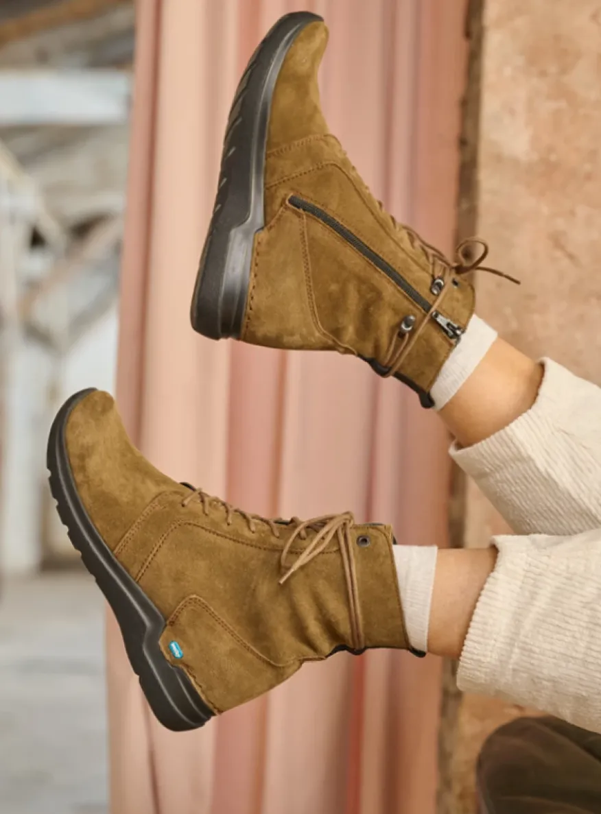De Bluff is een gloednieuwe veterlaars uit de Wally-lijn met een buitengewoon schokabsorberende zool, waardoor je voeten minder snel vermoeid raken. Je voet wikkelt zich op een juiste manier af, doordat de zool voor wat oploopt. Speels detail: hoewel het lijkt alsof de veter rond de enkel wordt geslagen, gaat die niet over de rits aan de binnenzijde heen. Je kunt dus gemakkelijk in- en uitstappen als je de rits opent, zonder dat je last hebt van de veter.Pasvorm: Geschikt voor gemiddelde tot vollere voeten (richtlijn breedtemaat G/H)De speciaal ontworpen achterkant voorkomt slippen van de hielLichtgewicht zoolMet leer omtrokken voetbedUitneembaar anatomisch voetbed – geschikt voor eigen zooltjesVolledig met leer gevoerd voor een goede vochtopnameGemaakt van zacht en soepel leerUitgerust met veter én rits – makkelijk in- en uitstappen en optimaal verstelbaarEffectieve hakhoogte: 1,5 cm (hakhoogte minus de zooldikte aan de voorzijde).Schachthoogte: 15,5 cm. Gebaseerd op maat 38, het aantal centimeters kan bij andere maten afwijken.
