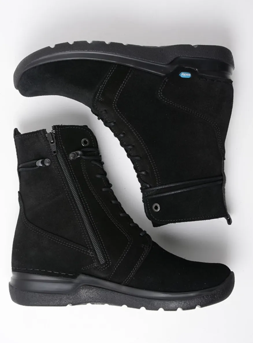 De Bluff is een gloednieuwe veterlaars uit de Wally-lijn met een buitengewoon schokabsorberende zool, waardoor je voeten minder snel vermoeid raken. Je voet wikkelt zich op een juiste manier af, doordat de zool voor wat oploopt. Speels detail: hoewel het lijkt alsof de veter rond de enkel wordt geslagen, gaat die niet over de rits aan de binnenzijde heen. Je kunt dus gemakkelijk in- en uitstappen als je de rits opent, zonder dat je last hebt van de veter.Pasvorm: Geschikt voor gemiddelde tot vollere voeten (richtlijn breedtemaat G/H)De speciaal ontworpen achterkant voorkomt slippen van de hielLichtgewicht zoolMet leer omtrokken voetbedUitneembaar anatomisch voetbed – geschikt voor eigen zooltjesVolledig met leer gevoerd voor een goede vochtopnameGemaakt van zacht en soepel leerUitgerust met veter én rits – makkelijk in- en uitstappen en optimaal verstelbaarEffectieve hakhoogte: 1,5 cm (hakhoogte minus de zooldikte aan de voorzijde).Schachthoogte: 15,5 cm. Gebaseerd op maat 38, het aantal centimeters kan bij andere maten afwijken.